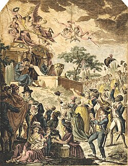La Constitution civile du clergé a divisé la population en deux camps antagonistes. Pour Michelet, Mignet ou Aulard, elle fut la grande faute de la Révolution française. Le drame de 1792-1793 est en germe. Dès 1790, des troubles entre protestants et catholiques avaient éclaté à Nîmes[63]. La question du serment dégénère en affrontement violent dans l'Ouest où les villes soutiennent les prêtres jureurs et les campagnes les réfractaires.