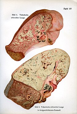 En 1882 enfin, à la suite des travaux de Louis Pasteur, Robert Koch met en évidence le bacille tuberculeux à partir de lésions humaines[24] : le , il communique d'abord à la Société de physiologie de Berlin une note sur la recherche et la culture du bacille de la tuberculose ; le , il publie dans le Berliner klinische Wochenschrift un mémoire sur l'étiologie de la tuberculose qu'il rapporte à un bacille décelé dans les crachats et les lésions tuberculeuses humaines.