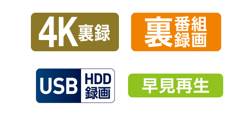 55V/50V/43V4Kチューナー2基搭載だからUSBハードディスクで4K放送も裏番組録画できる。