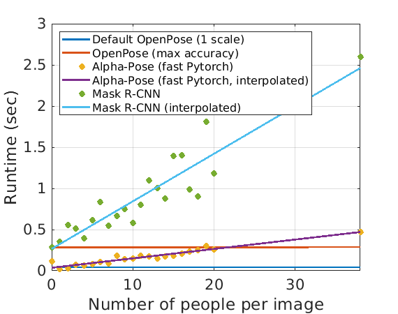 We show an inference time comparison between the 3 available pose estimation libraries (same hardware and conditions): OpenPose, Alpha-Pose (fast Pytorch version), and Mask R-CNN. The OpenPose runtime is constant, while the runtime of Alpha-Pose and Mask R-CNN grow linearly with the number of people. More details here.