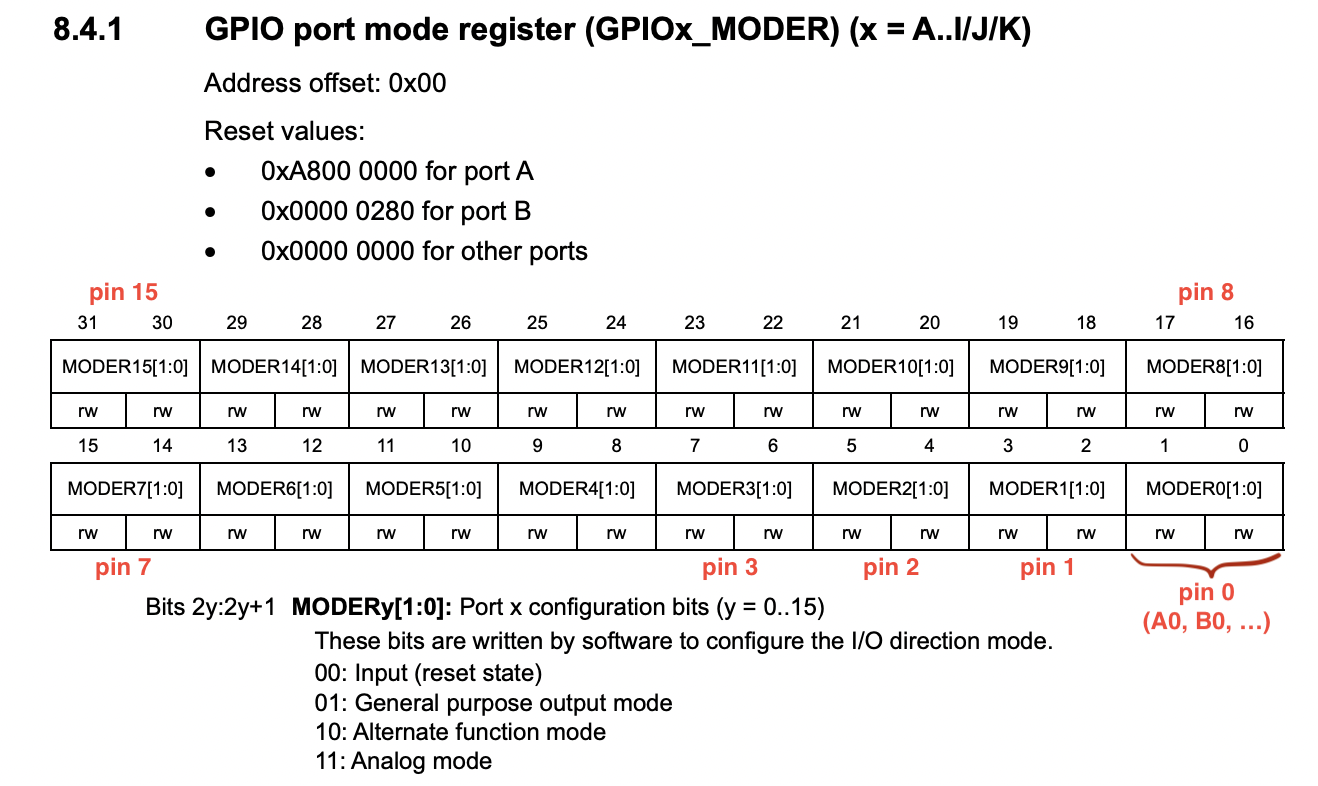 * (volatile uint32_t *) (0x40020000 + 0) |= 1 << 6; // Set bit range 6-7 to 1That is pretty cryptic. Without extensive comments, such code would be quite hard to understand. We can rewrite this code to a much more readable form. The idea is to represent the whole peripheral as a structure that contains 32-bit fields. Let's see what registers exist for the GPIO peripheral in the section 8.4 of the datasheet. They are MODER, OTYPER, OSPEEDR, PUPDR, IDR, ODR, BSRR, LCKR, AFR. Their offsets are with offsets 0, 4, 8, etc... . That means we can represent them as a structure with 32-bit fields, and make a define for GPIOA: