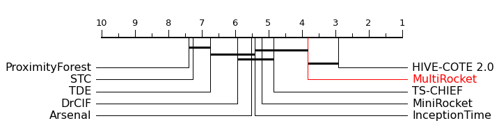 These are the results on 30 resamples of the 109 UCR Time Series archive from the UCR Time Series Classification Archive. MultiRocket is on average the current most accurate scalable TSC algorithm, that is not significantly less accurate than HIVE-COTE 2.0.
