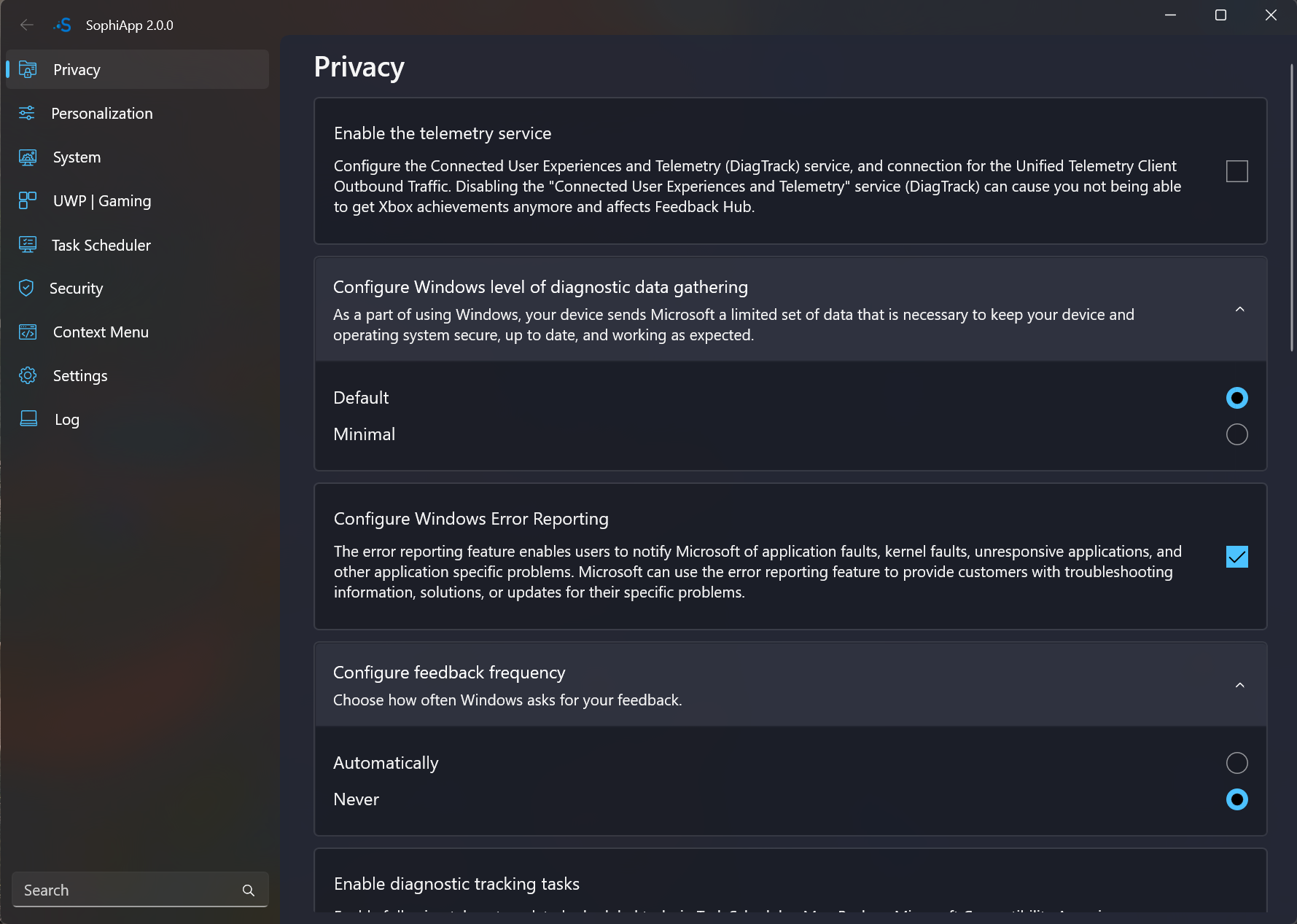 Sophia -Functions "DiagTrackService -Disable", "DiagnosticDataLevel -Minimal", UninstallUWPApps