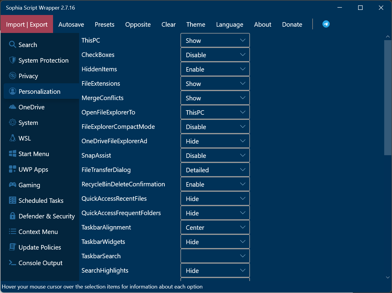 Every tweak in the preset file has its' corresponding function to restore the default settings. Running the script is best done on a fresh install because running it on wrong tweaked system may result in errors occurring.