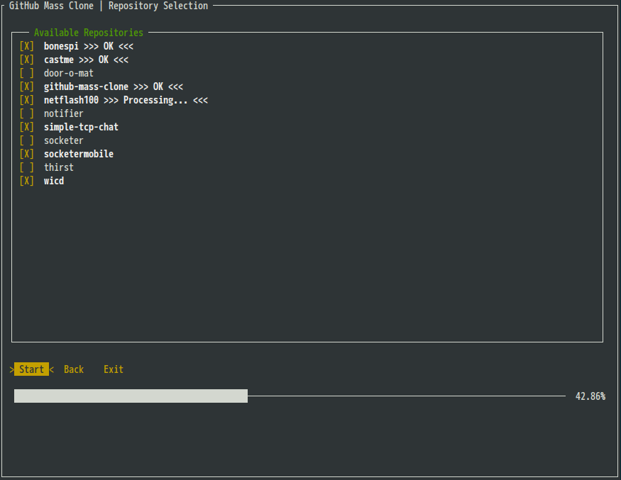 GitHub Mass Clone is a simple curses based tool written in Python which can list repositories of a particular user or organization from GitHub for cloning them.