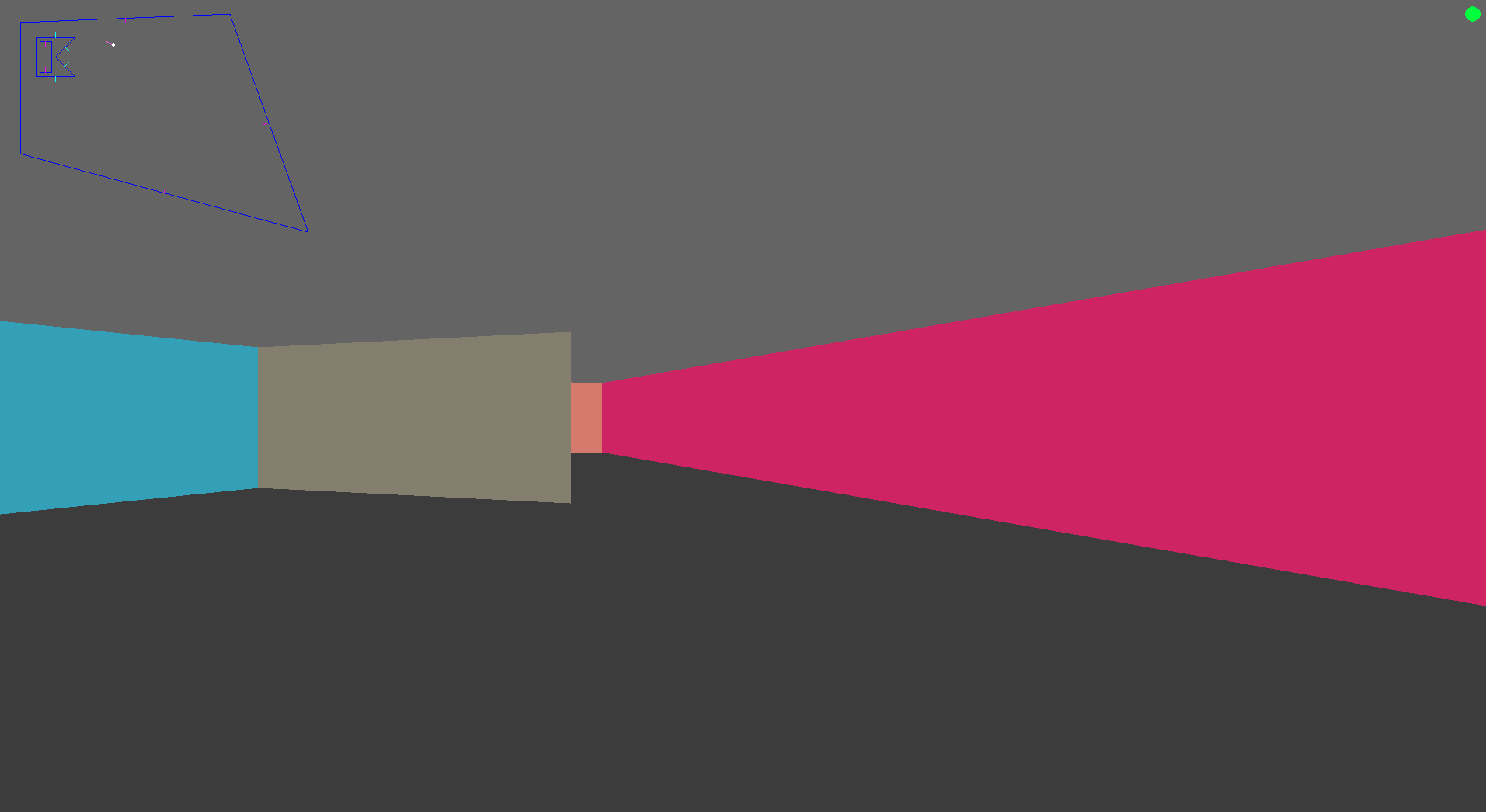For rendering I went with Pygame's basic 2D shapes such as the polygon for rendering walls. I glued together various tutorials from other programmers such as Bisqwit to get my hardcoded projection matrices to produce the correct rendering. The result was as follows: