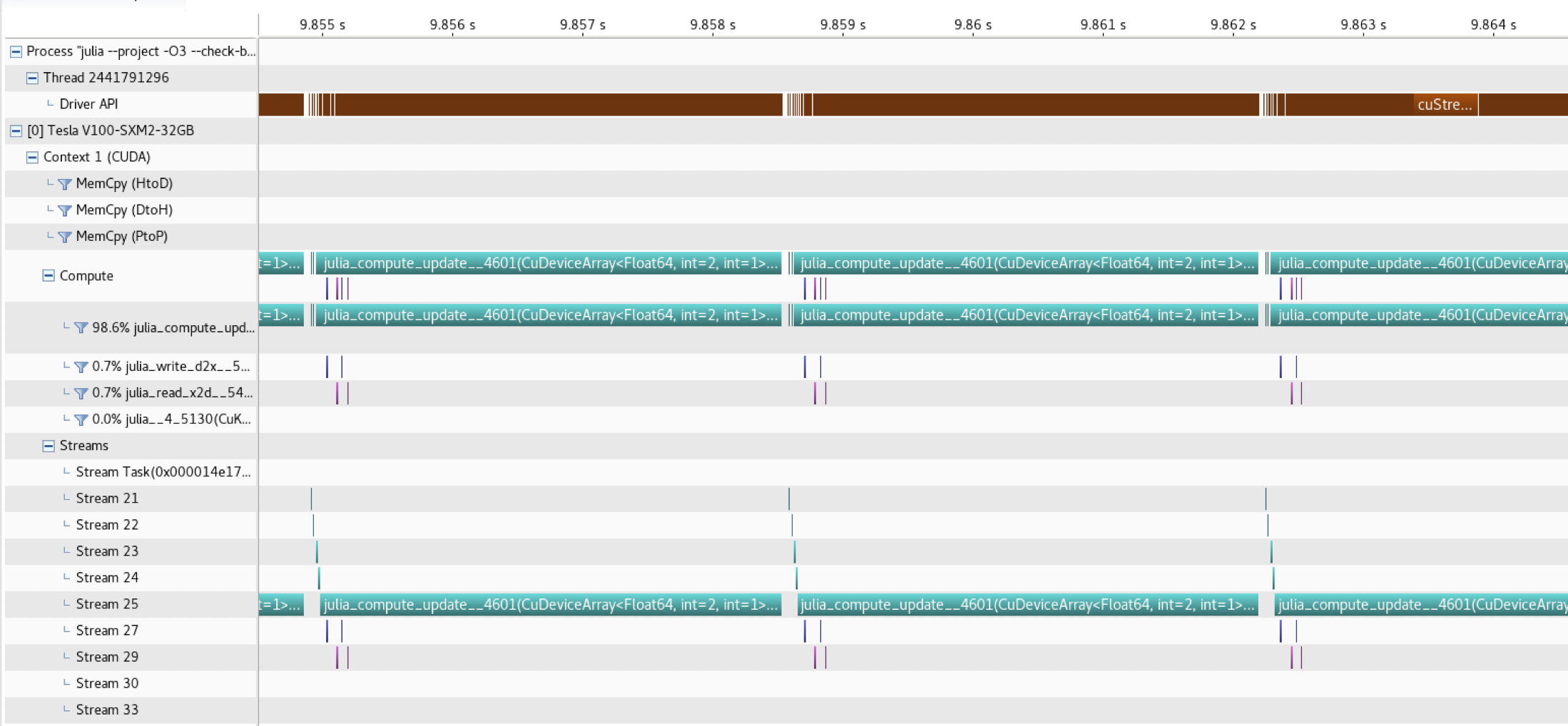 The MPI communication (purple bars) nicely overlap the compute_update!() kernel execution. Further infos can be found here.
