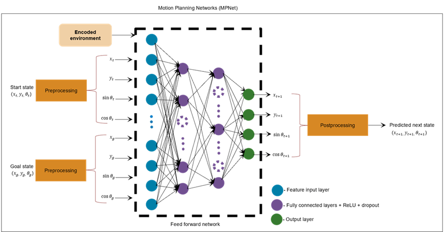 Motion Planning Networks (MPNet) is a deep-learning-based approach for finding optimal paths between a start point and goal point in motion planning problems. MPNet is a deep neural network that can be trained on multiple environments to learn optimal paths between various states in the environments. The MPNet uses this prior knowledge to,