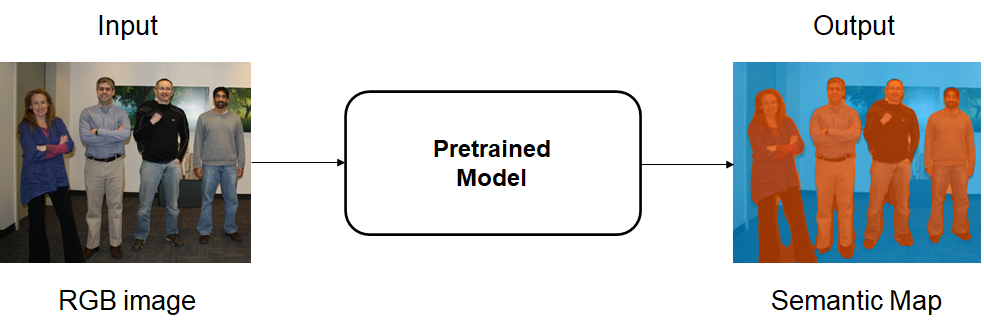 Inputs are images, outputs are translated RGB images. This example workflow shows how a semantic segmentation map input translates to a synthetic image via a pretrained model (Pix2PixHD):