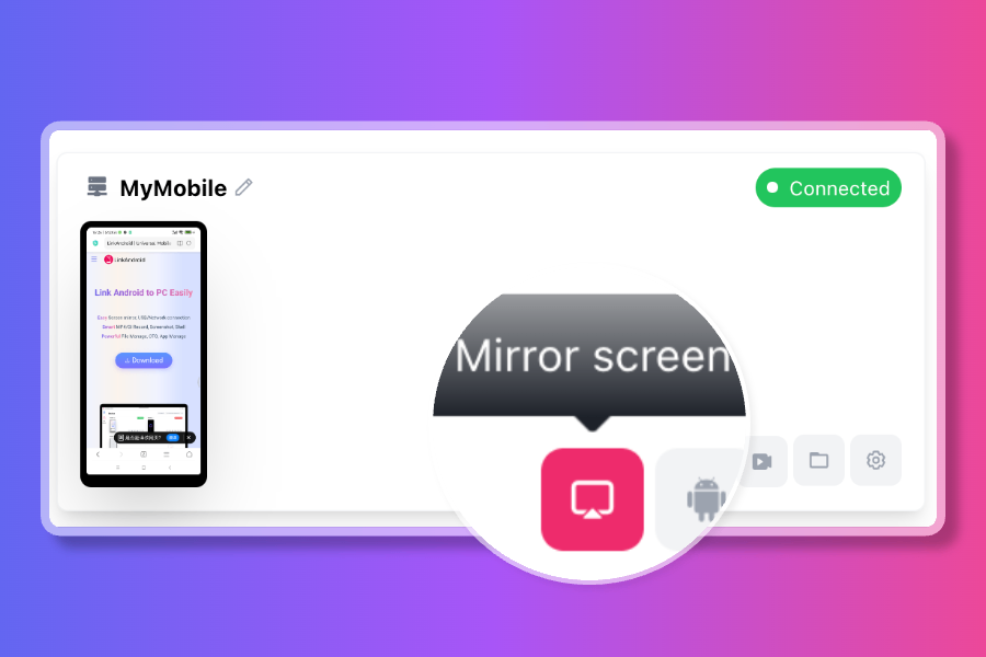LinkAndroid is an all-in-one mobile connection assistant 🚀 that lets you easily connect your Android device to your computer 📱💻. Once connected, enjoy powerful features like screen mirroring, GIF/MP4 recording, screenshots, file management, and phone operations, making mobile management simple and efficient!