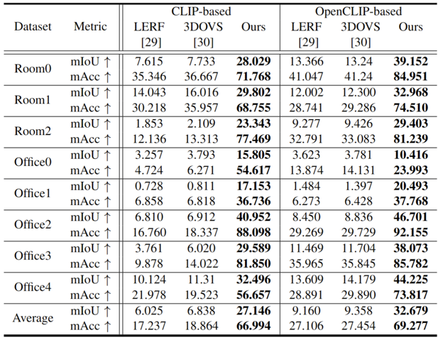 Abstract: The development of Neural Radiance Fields (NeRFs) has provided a potent representation for encapsulating the geometric and appearance characteristics of 3D scenes. Enhancing the capabilities of NeRFs in open-vocabulary 3D semantic perception tasks has been a recent focus. However, current methods that extract semantics directly from Contrastive Language-Image Pretraining (CLIP) for semantic field learning encounter difficulties due to noisy and view-inconsistent semantics provided by CLIP. To tackle these limitations, we propose OV-NeRF, which exploits the potential of pre-trained vision and language foundation models to enhance semantic field learning through proposed single-view and cross-view strategies. First, from the single-view perspective, we introduce Region Semantic Ranking (RSR) regularization by leveraging 2D mask proposals derived from Segment Anything (SAM) to rectify the noisy semantics of each training view, facilitating accurate semantic field learning. Second, from the cross-view perspective, we propose a Cross-view Self-enhancement (CSE) strategy to address the challenge raised by view-inconsistent semantics. Rather than invariably utilizing the 2D inconsistent semantics from CLIP, CSE leverages the 3D consistent semantics generated from the well-trained semantic field itself for semantic field training, aiming to reduce ambiguity and enhance overall semantic consistency across different views. Extensive experiments validate our OV-NeRF outperforms current state-of-the-art methods, achieving a significant improvement of 20.31% and 18.42% in mIoU metric on Replica and Scannet, respectively. Furthermore, our approach exhibits consistent superior results across various CLIP configurations, further verifying its robustness.