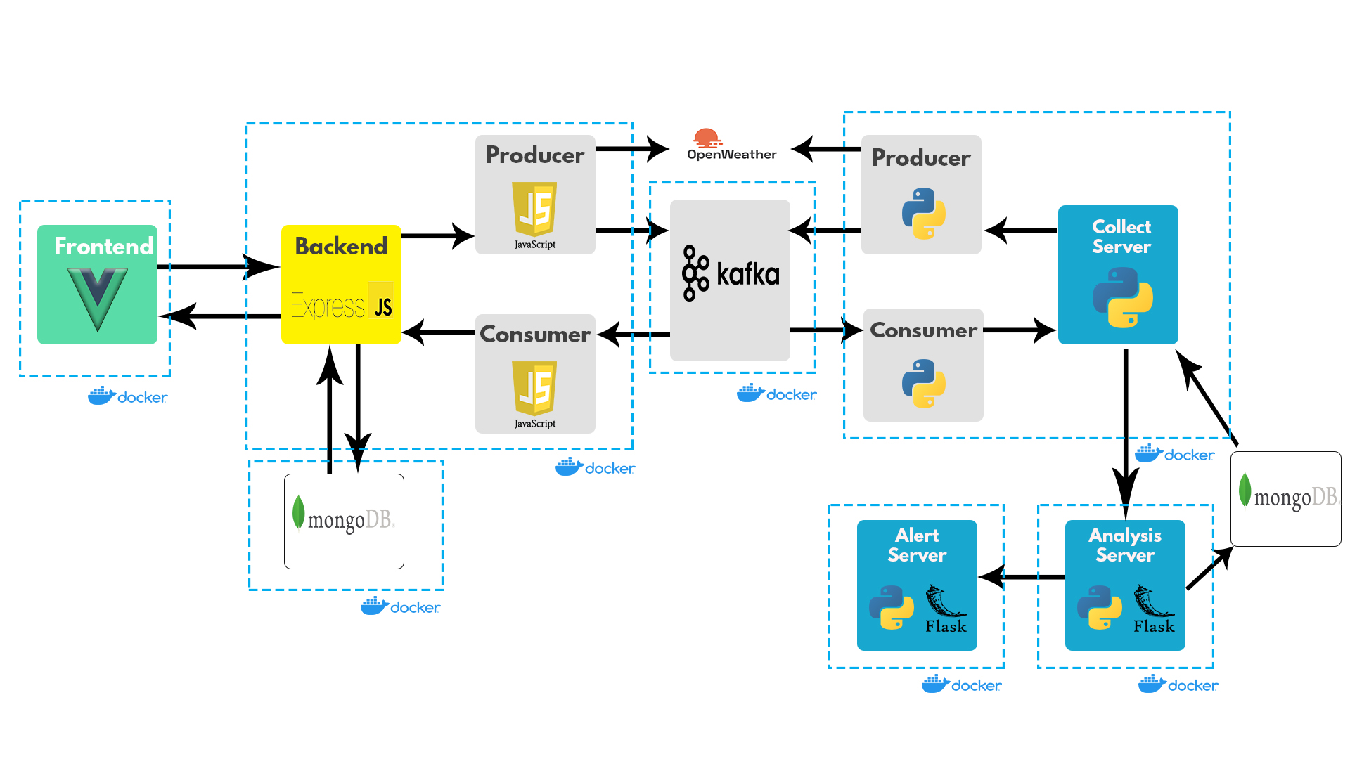 This project is a distributed application that uses the Open Weather API to provide accurate and up-to-date weather information to its users. The app will provide valuable information to users, such as forecasts for the near future, long-term weather trends, and immediate alerts in case of extreme weather conditions. To ensure data consistency and accessibility, we will deploy Docker containers to run the web application and Kafka to handle real-time data streams. Additionally, we will use a Python pipeline to process the obtained weather data and save it to a Mongodb database for future analysis.