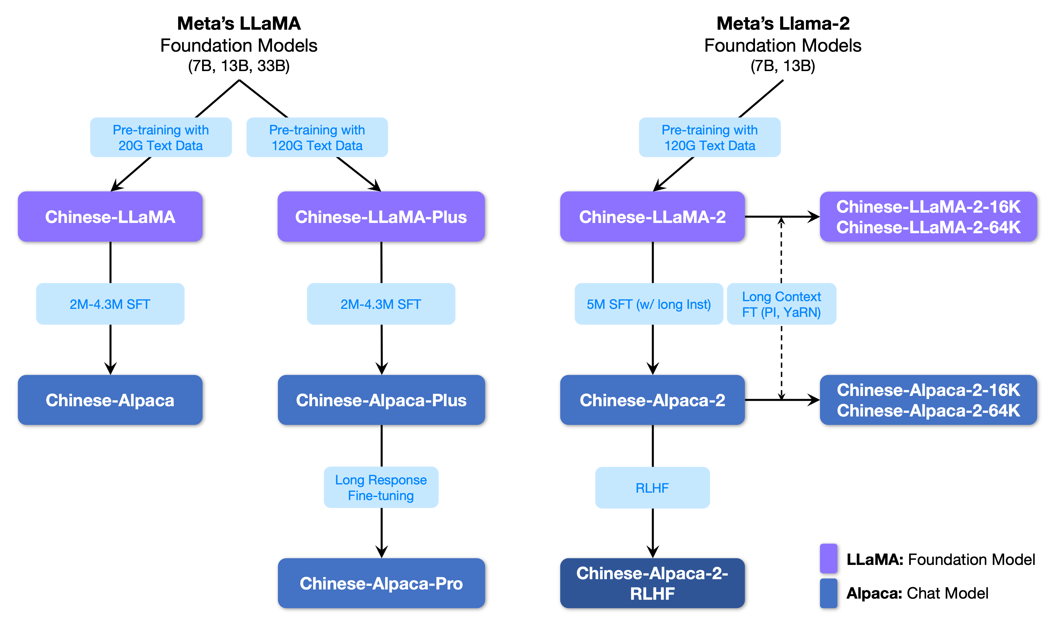 - 聊天模型(4K上下文):Chinese-Alpaca-2 (1.3B, 7B, 13B)