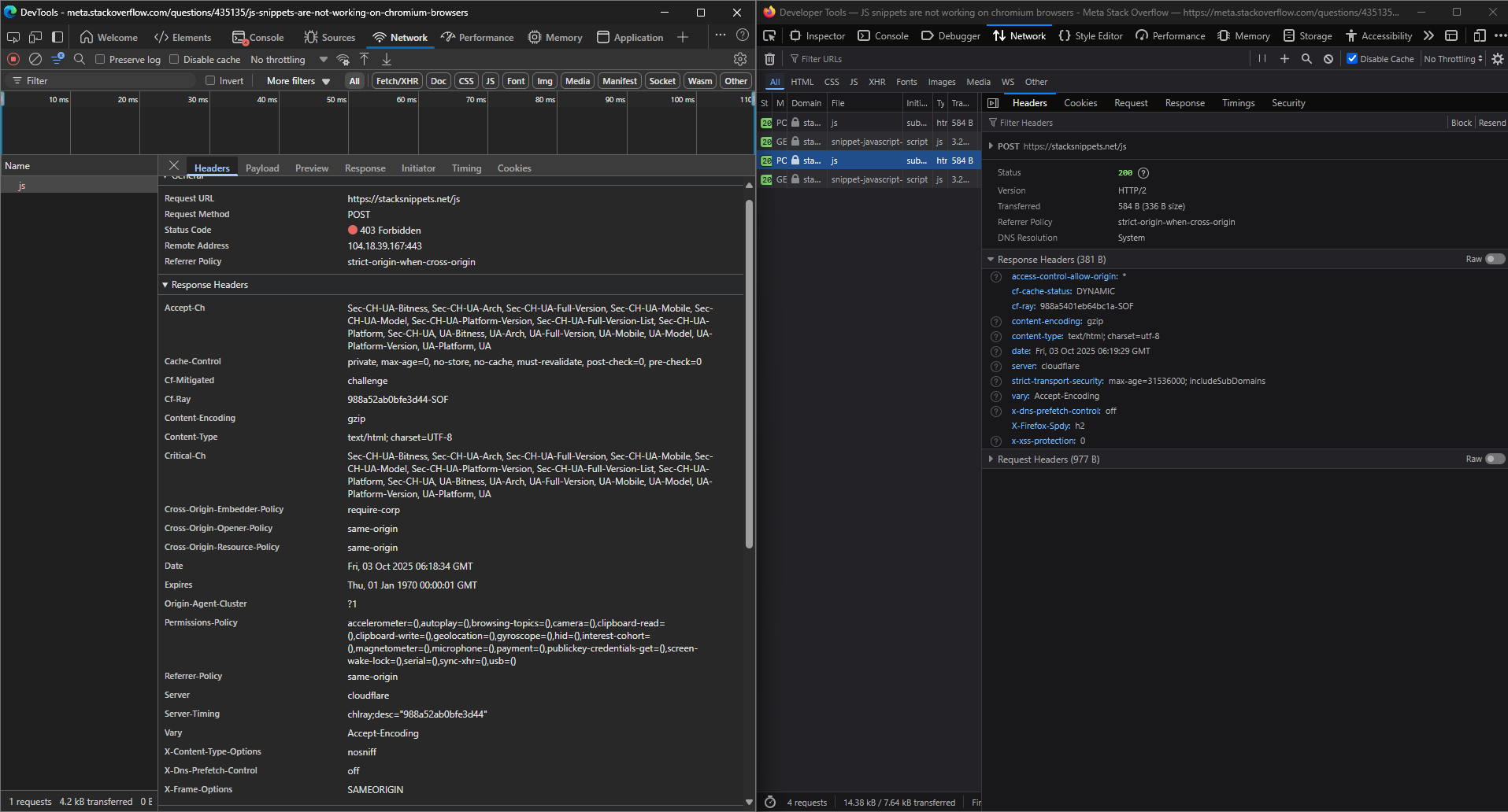 Interestingly, I do get quite different response headers for the stacksnippets request in Edge (left) and Firefox (right). Notably, in Edge I get the X-Frame-Options (which is what blocks the Stack Snippet from running), while I don't get that in Firefox. But the number of headers is also just different. Moreover, I do get some sort of specific header for Firefox (X-Firefox-Spdy ) on the request made from Firefox. Which leads me to suspect the server does have different responses for browsers.