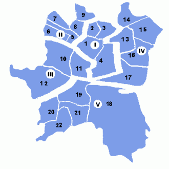 [bewerken | brontekst bewerken]Katowice bestaat sinds 1997 uit vijf stadsdistricten (zespoły dzielnic) die op hun beurt zijn verdeeld in 22 stadsdelen (dzielnice).
