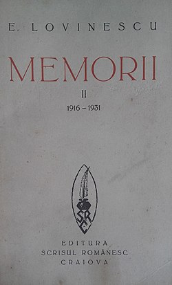 [modificare | modificare sursă]De la această dată relațiile cu animatorul Vieții românești se înrăutățesc și, până la sfârșit, ele vor cunoaște toate formele polemicii autohtone. E. Lovinescu a rămas însă un simplu profesor de latină la liceul Matei Basarab din București toată viața sa. Nu știm, azi, dacă trebuie să regretăm sau nu ținerea lui Lovinescu departe de Universitate și de Academie. E, desigur, la mijloc o mare nedreptate, nu singura, firește, ce s-a făcut în cultura română, căci în timp ce nume azi cu desăvârșire uitate au ocupat fotolii academice sau au ținut în fața amfiteatrelor goale lecții plicticoase, mediocre compilații, multe spirite înalte au fost sistematic respinse de la orice recunoaștere.