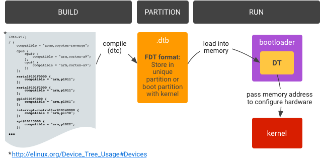 dtc) to compile DTS (.dts) into a DTB (.dtb). The DTB is formatted as a flattened DT. 1b. Flash the.dtbfile into a bootloader runtime-accessible location (detailed below).To partition, determine a bootloader runtime-accessible and trusted location in flash memory to put