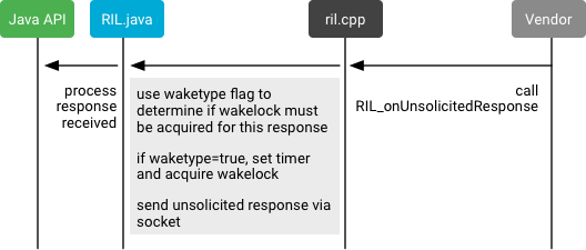 In this scenario, RIL unsolicited responses have a wakelock type flag in the that indicates whether a wakelock needs to be acquired for the vendor response. If the flag is set, a timed wakelock is set and the response is sent over a socket to the Java side. When the timer expires, the wakelock is released. The timed wakelock could be too long or too short for different RIL unsolicited responses.