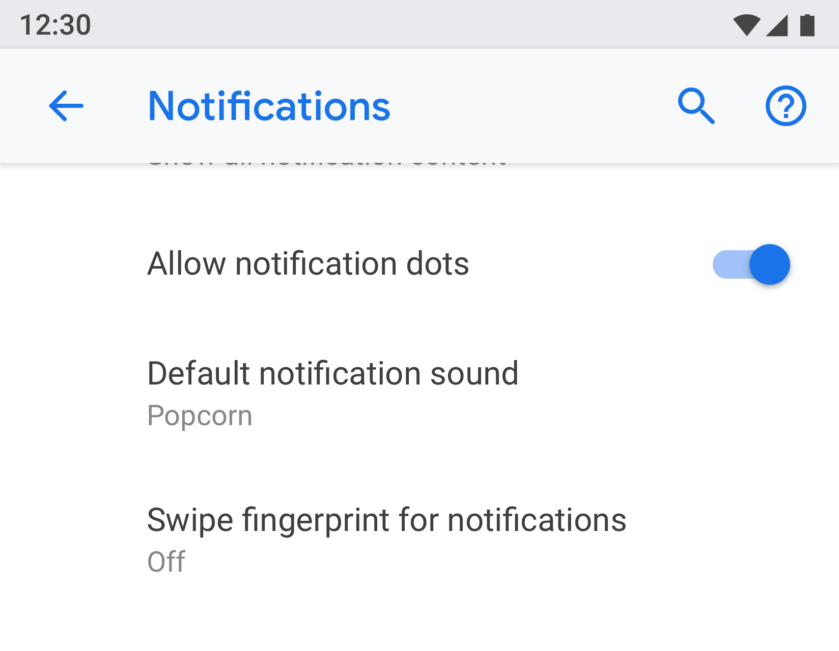 If a screen has many settings, they can be grouped and separated by a divider. Unlike older Android versions, dividers are now used to cluster settings in a group, rather than separating individual settings.