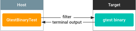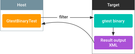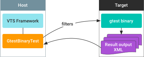 In VTS, the default test format is host-side Python tests extended from BaseTest in VTS runner. To integrate target-side tests, you must first push the test files to device, execute the tests using shell commands, then parse the results using host-side Python scripts.
