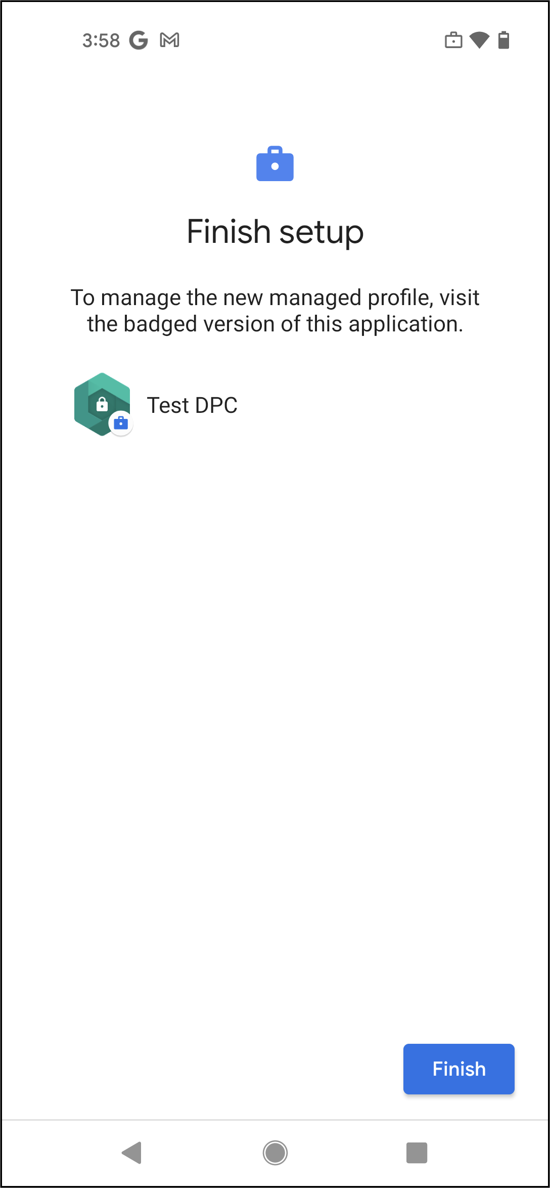 The simplest way to test the work profile user experience is by setting up a work profile using the Test DPC app. The following steps describe how to setup a work profile on a personal device (BYOD scenario):