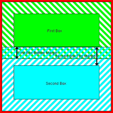 In figure 5, two boxes are placed in a containing block. The thick red line shows the limits of the containing block. The first box is placed with its margins touching the edges of the containing block. The top margin of the second box is larger than the bottom margin of the first box, so that is the distance between the two boxes' borders (the opaque areas indicate the border, padding and content areas of the boxes).