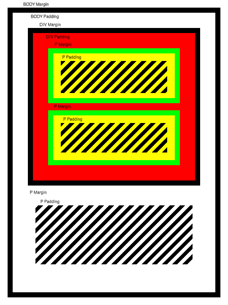 The black stripes in figure 7 stand for the actual content of the paragraphs. Although you'd probably never design anything looking quite like that document unless you're in the biohazard warning sign business, figure 7 serves to show what is possible with even this small subset of the capabilities of the CSS visual formatting model. But in order to achieve all of this formatting, you need to use the correct properties.