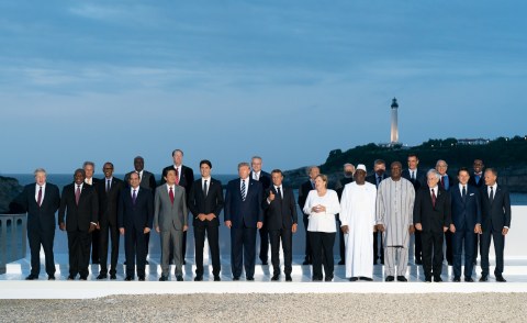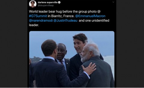 The tweet now says: "World leader group hug before the group photo at #G7Summit in Biarritz, France. @EmmanuelMacron @CyrilRamaphosa @JustinTrudeau @narendramodi."