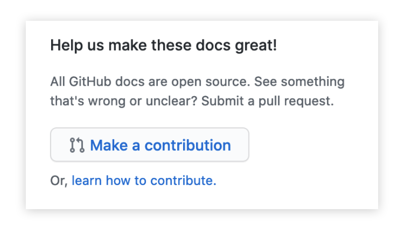On the GitHub Docs site, you can click the make a contribution button to open a pull request for quick fixes like typos, updates, or link fixes.