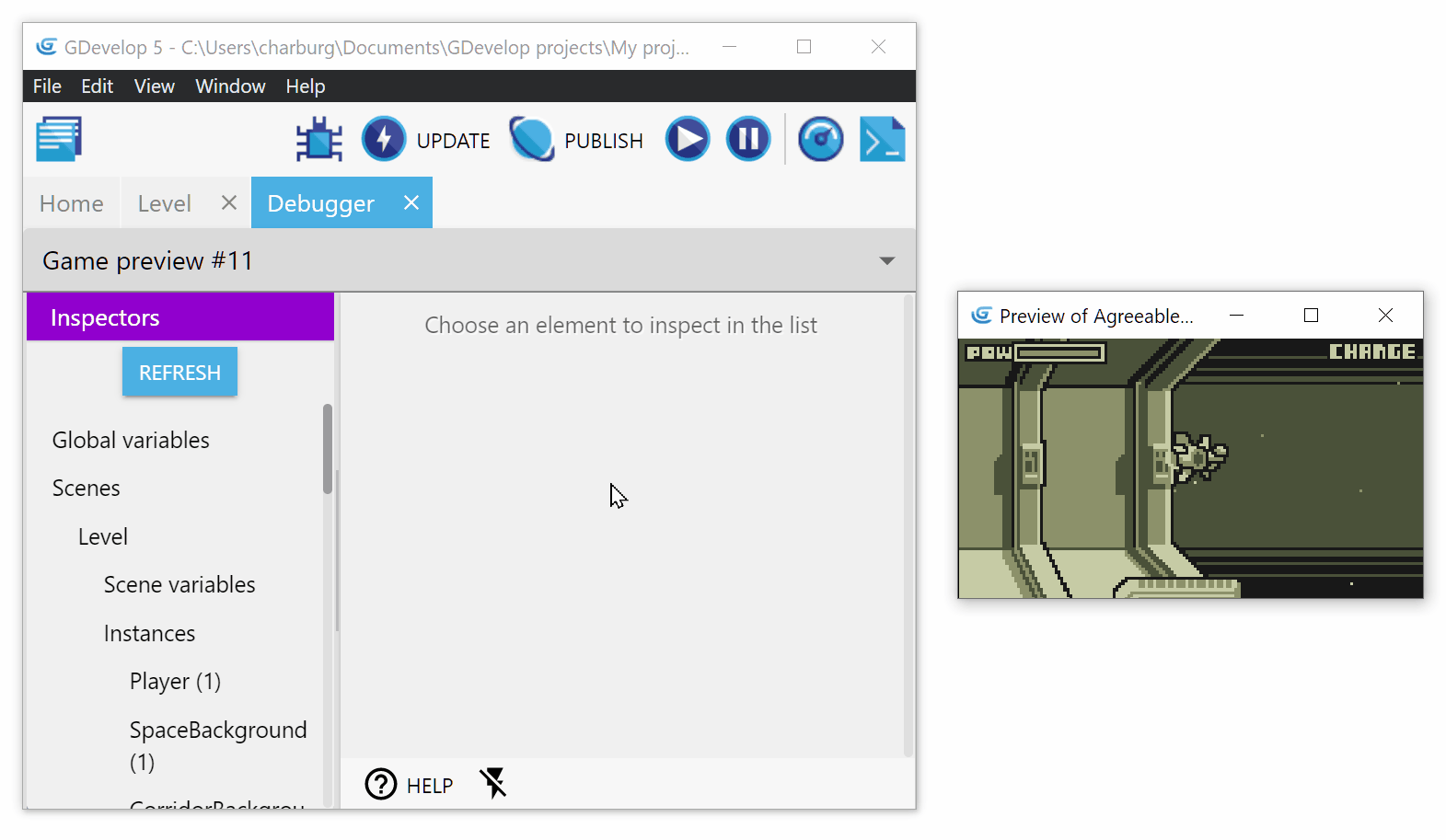 This will open a new tab called "Debugger" and will also launch a preview of your game as usual.