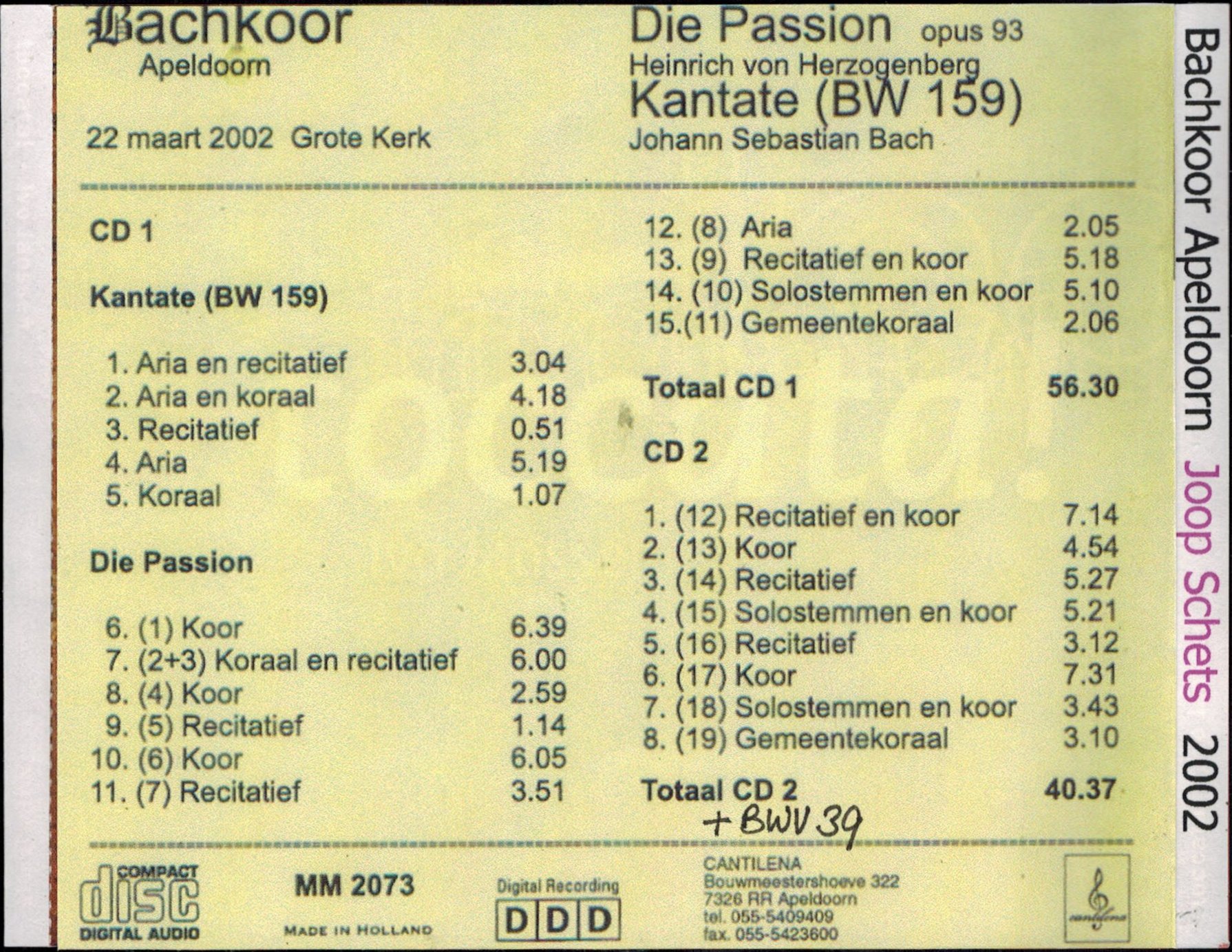 Soloists: Alto: Franske van der Wiel; Tenor: Adriaan De Koster; Basses: Michiel Meijer, Florian Just; Gerben Budding (Organ)