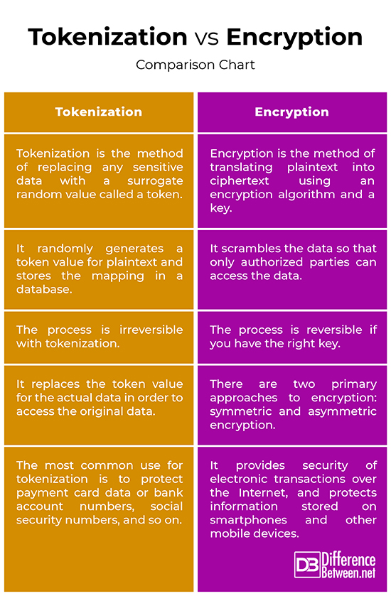 – Both tokenization and encryption are methods used to secure sensitive information or data that is often transmitted over the Internet. While both are effective obfuscation solutions for data security, they are very different from each other. Tokenization is the method of replacing any sensitive data with a surrogate random value called a token, which is a reference to the original data through a tokenization system. Encryption, on the other hand, is the method of translating plaintext into ciphertext using an encryption algorithm and a key.