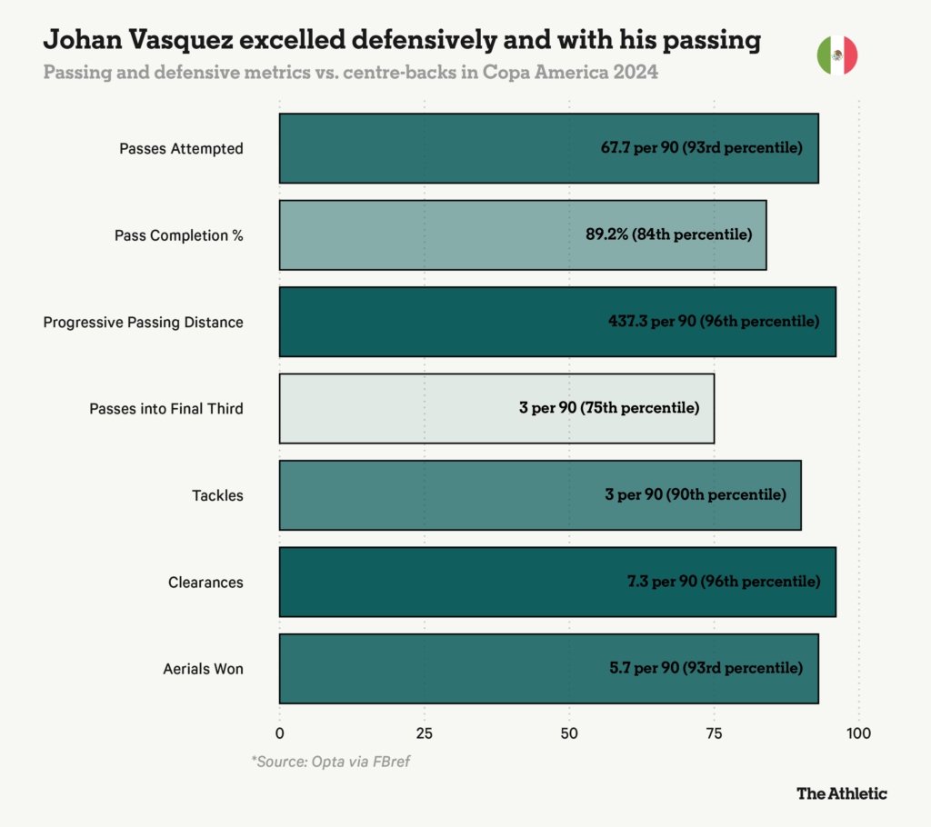 Vasquez was a dominant presence in Mexico’s back line, which conceded just one goal, while his passing was brave. He was also an adept carrier of the ball, with his 1.0 progressive carries per 90 minutes ranking him in the top 26 per cent of central defenders in the tournament.